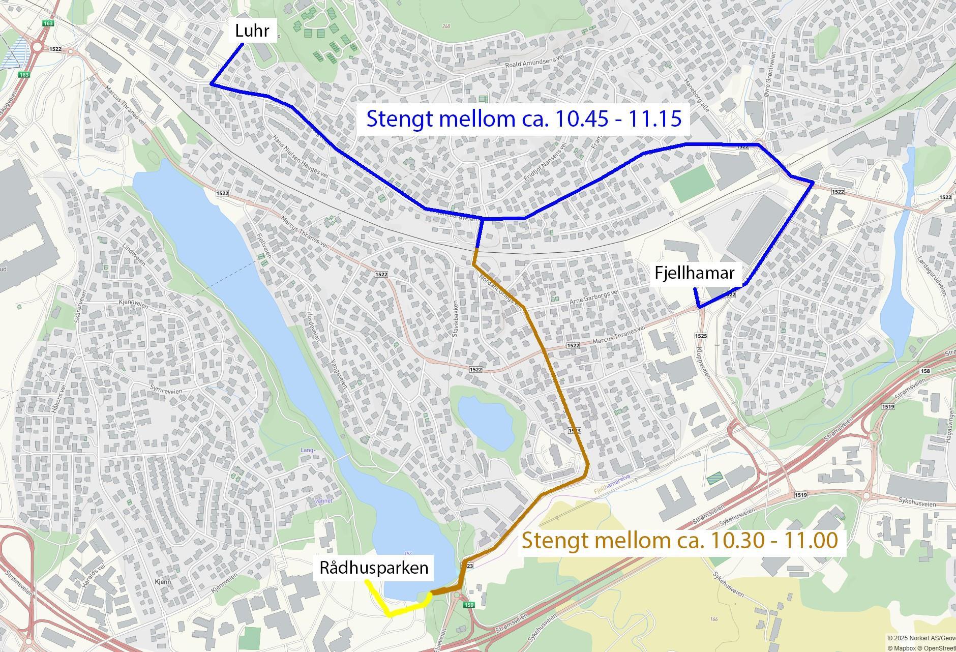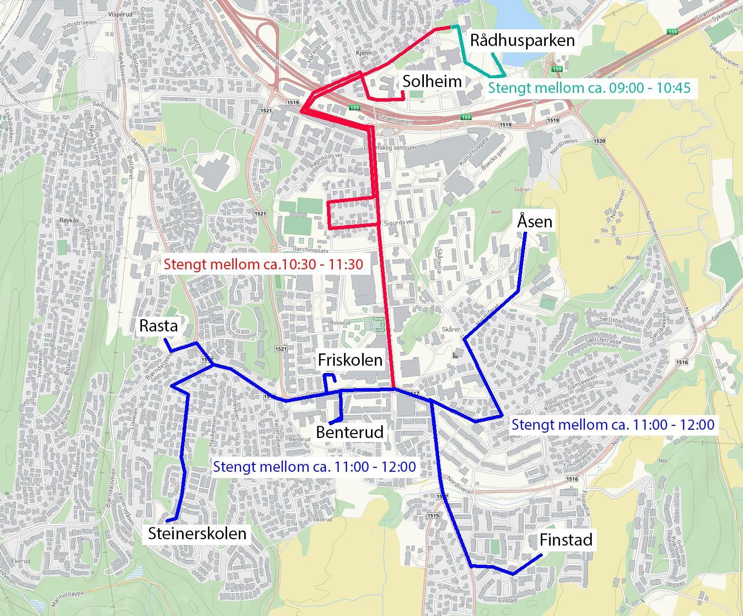 Stengte veier Kjenn, Lørenskog sentrum, Rasta, Benterud, Finstad og Åsen